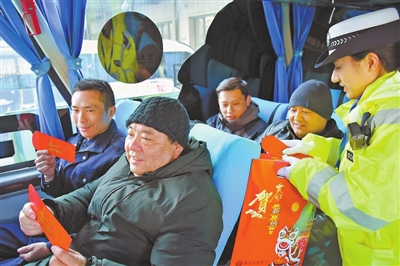 ▲ 蛇年春节将至,为做好辖区春运期间道路交通安全管理工作,南昌市公安局交通管理局西湖大队民警近日走进长途汽车站,检查驾驶人情况、乘客系安全带情况,同时给即将发车的驾驶员和乘客送上新春祝福。