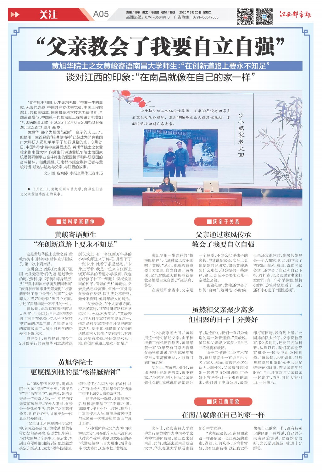 黄旭华,那个为祖国“深潜”一辈子的人,走了。但他用一生诠释的“核潜艇精神”已经成为照亮我国广大科研人员和莘莘学子前行道路的光。3月21日,中国科学家精神宣讲团成员、黄旭华院士之女黄峻来到南昌大学,向师生们讲述黄旭华院士为国家核潜艇研制事业奋斗终生的爱国情怀和科研报国的奋斗精神。借此契机,江南都市报全媒体记者与黄峻对话,听她讲述她与父亲、与江西的故事。